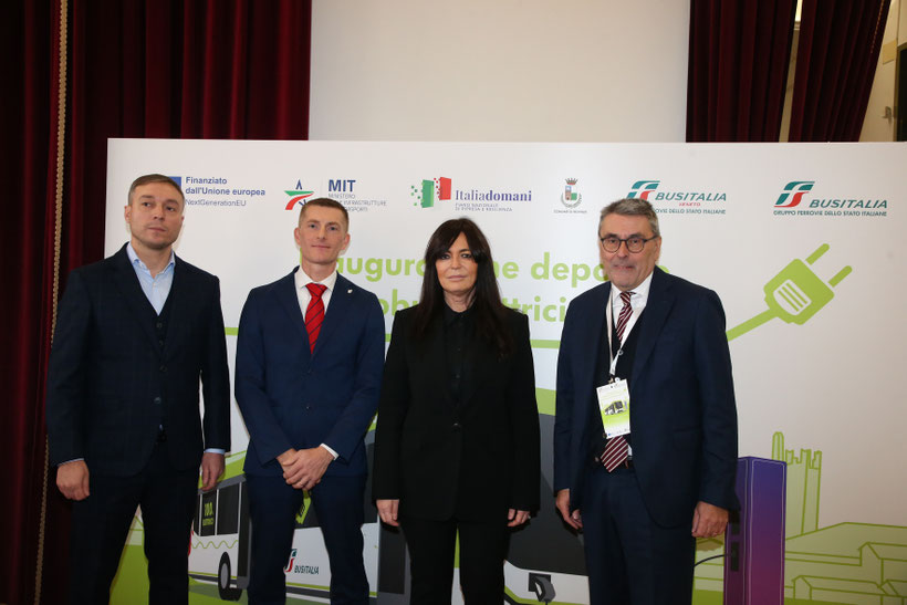 A presentare i nuovi mezzi e le nuove infrastrutture di ricarica, presso il Salone d’Onore di Palazzo Nodari, sede del Comune di Rovigo: Valeria Cittadin, Sindaco della Città di Rovigo, Enrico Ferrarese, Presidente della Provincia di Rovigo, Michele Aretusini, Assessore ai Trasporti e alla Mobilità Sostenibile del Comune di Rovigo, Flavio Nogara, Presidente di Busitalia e Gino Colella, Amministratore Delegato e Direttore Generale di Busitalia Veneto.
